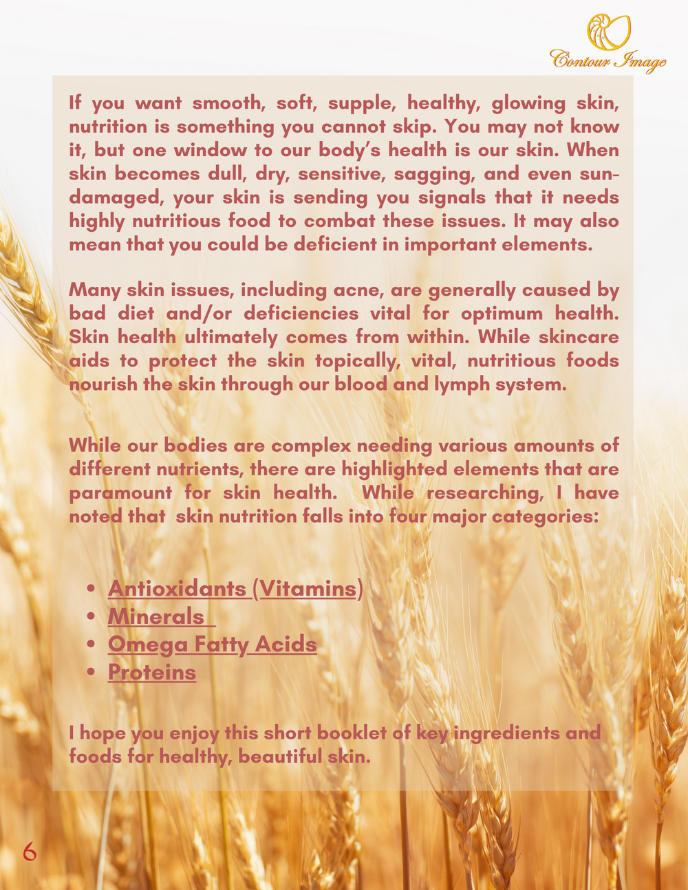 - The most basic nutrition on vitamins, antioxidants, minerals, fats, and proteins for optimum skin health.