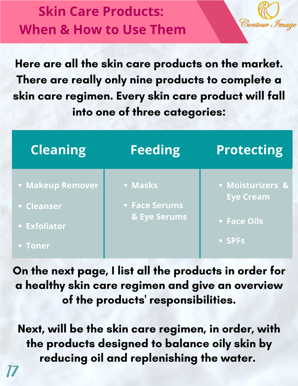 - Skin care products for cleaning, feeding, and protecting your oily skin; how and when to use them.