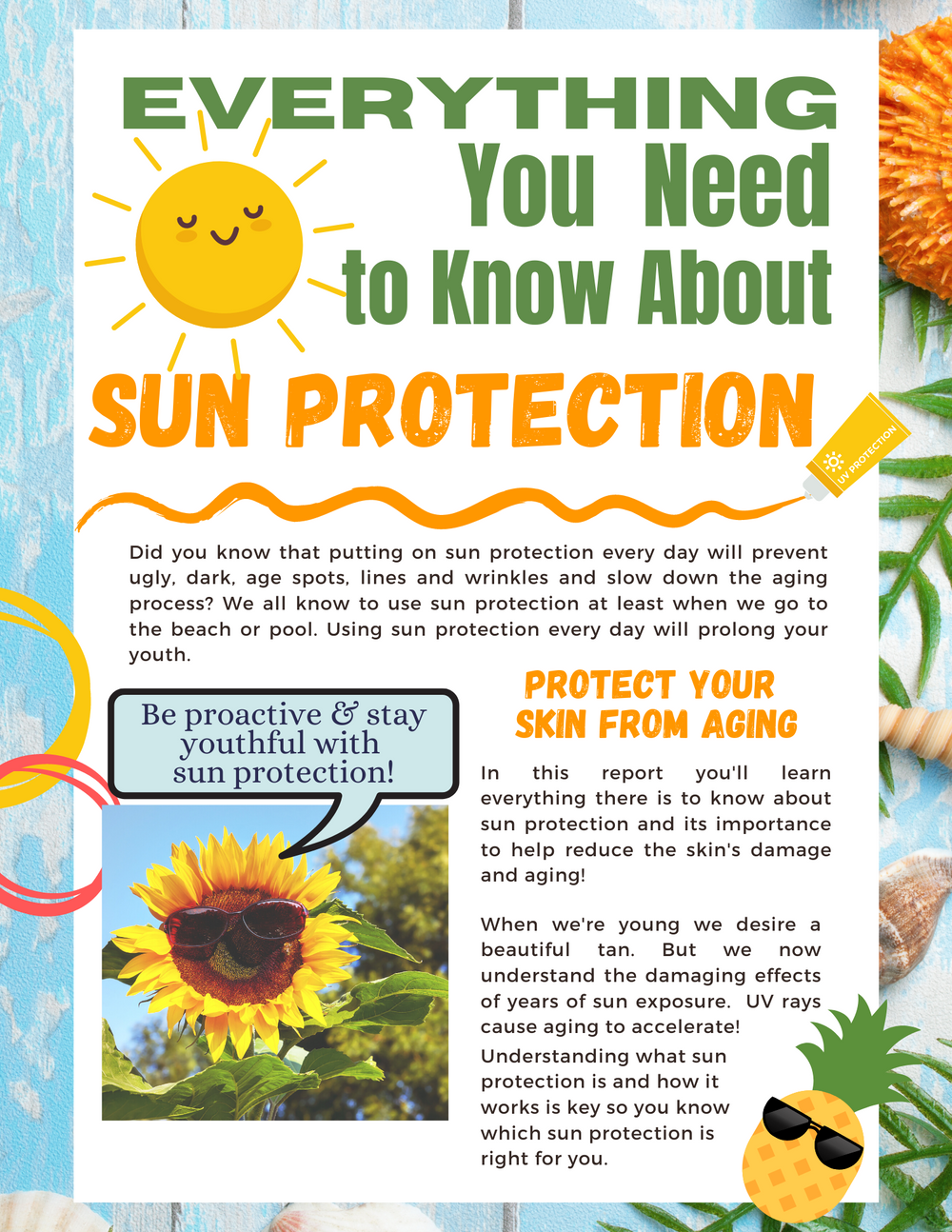 In this 6 page, colorful, easy-to-read, detailed skin's sun Protection report, you'll gain a full understanding of what SPFs are, and how they work. So you can protect your skin from future damage.